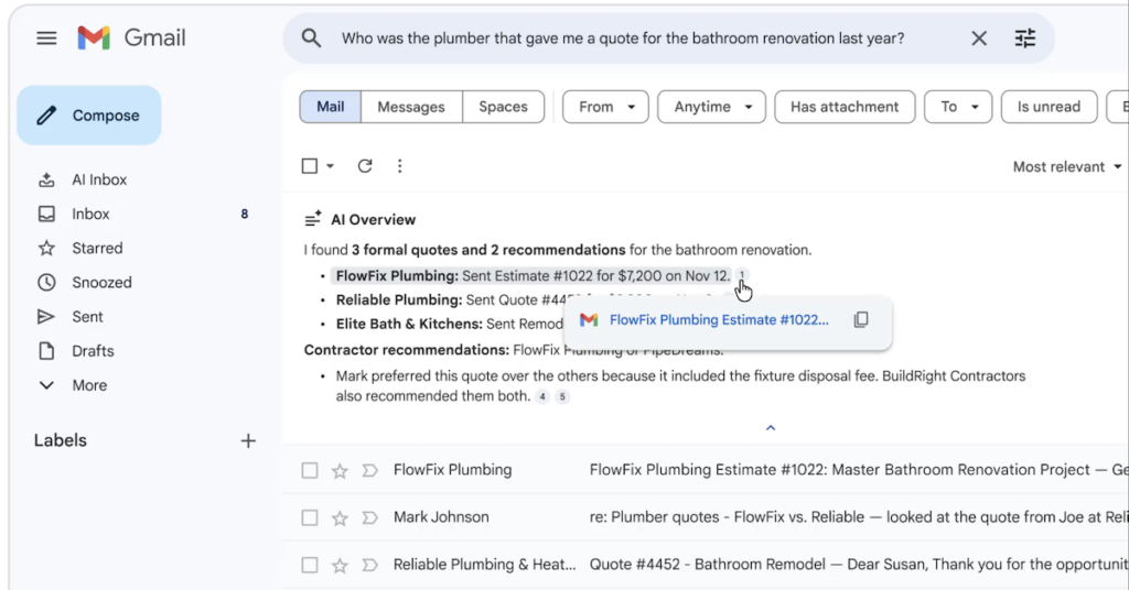 หนึ่งในไฮไลต์สำคัญคือ AI Overviews ที่เข้ามาช่วยแก้ปัญหาคลาสสิกของอีเมลยุคใหม่ นั่นคือ “ข้อมูลเยอะ แต่หาอะไรไม่เจอ” แทนที่จะต้องค้นหาอีเมลย้อนหลังเป็นปี หรือเปิดอ่านอีเมลยาว ๆ ทีละฉบับ Gemini จะสังเคราะห์ข้อมูลทั้งหมดให้กลายเป็น คำตอบสั้น กระชับ และตรงประเด็น เช่น เมื่อถามว่า “ช่างประปาที่เคยให้ใบเสนอราคาตกแต่งห้องน้ำเมื่อปีที่แล้วคือใคร?” Gemini จะใช้การให้เหตุผลขั้นสูง ดึงข้อมูลที่เกี่ยวข้องจากกล่องจดหมาย พร้อมสรุปคำตอบให้ทันที