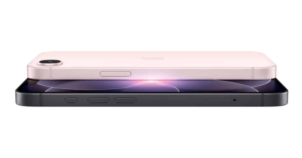 iPhone 17e ใช้วัสดุอะลูมิเนียมเกรดเดียวกับอุตสาหกรรมอวกาศ จึงแข็งแรงและน้ำหนักเบา ดีไซน์ผิวด้านให้เลือก 3 สี ได้แก่ สีดำ สีขาว และสีชมพูอ่อน