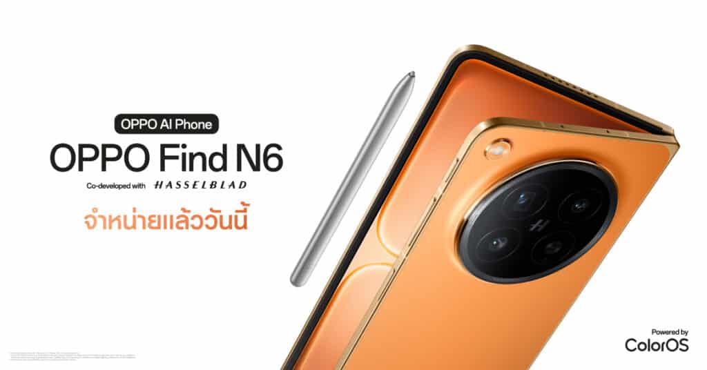 OPPO ประกาศวางจำหน่าย “OPPO Find N6” สมาร์ตโฟนจอพับรุ่นใหม่ล่าสุด ที่มาพร้อมกับสโลแกน “เรียบกว่า อิสระกว่า ทรงพลังทุกมิติ” ครั้งแรกของอุตสาหกรรม กับรอยพับที่แทบมองไม่เห็น อย่างเป็นทางการในประเทศไทย ในราคา 79,999 บาท ผ่าน OPPO Brand Shop และตัวแทนจำหน่ายทั่วประเทศ เตรียมพบกับสมาร์ตโฟน OPPO Find N6 วางจำหน่ายวันที่ 21 มีนาคม 2569 เป็นต้นไป และสำหรับผู้ที่ซื้อ OPPO Find N6 ระหว่างวันที่ 21 มีนาคม 2569 – 30 เมษายน 2569 จะได้รับของสมนาคุณรวมมูลค่า 45,297 บาท พร้อมบริการ Premium Service สัมผัสประสบการณ์การดูแลระดับพรีเมียมจาก OPPO อย่างเต็มรูปแบบ และโปรโมชันสุดพิเศษ โปรโมชัน Trade-up เก่าแลกใหม่