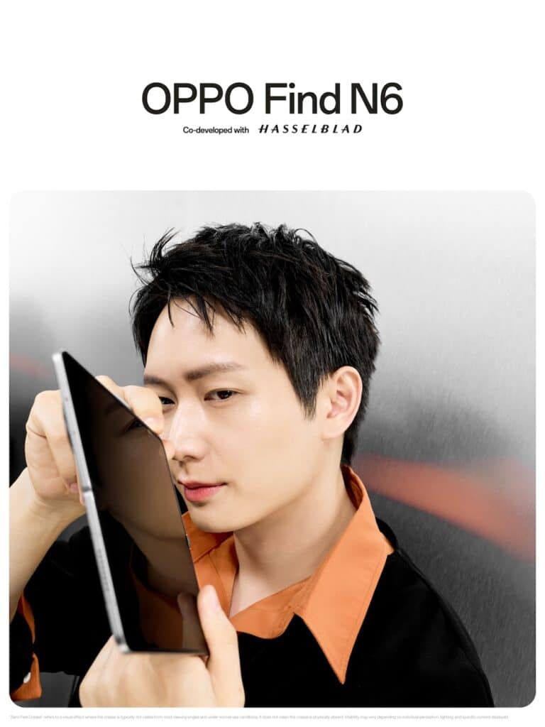 OPPO Find N6 กับประสบการณ์แบบอัปเกรด มาพร้อมนิยามใหม่แห่งดีไซน์ ด้วยรอยพับที่แทบมองไม่เห็น ด้วยนวัตกรรมบานพับรุ่นใหม่ที่ช่วยลดรอยพับบนหน้าจอได้อย่างมีประสิทธิภาพ จนกลายเป็น ครั้งแรกของอุตสาหกรรมสมาร์ตโฟนจอพับที่รอยพับแทบมองไม่เห็น มอบประสบการณ์การใช้งานหน้าจอที่เรียบเนียนยิ่งขึ้น ทั้งการดูคอนเทนต์ หรือทำงานบนหน้าจอขนาดใหญ่ พร้อมด้วยบานพับไทเทเนียม เจเนอเรชั่น 2 เพิ่มประสิทธิภาพในหลากหลายมิติเพื่อความเรียบเนียนของหน้าจอ ตัวเครื่องยังมาพร้อมดีไซน์บางเบา มอบสัมผัสการใช้งานที่ลงตัวในทุกมิติ