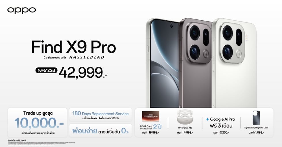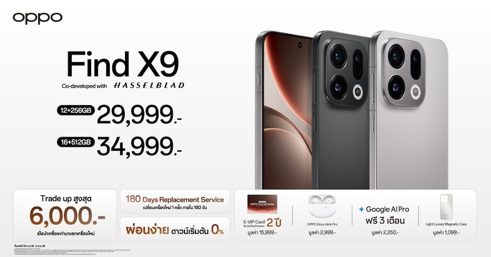 ออปโป้ ประเทศไทย เปิดตัวสมาร์ตโฟนแฟลกชิปรุ่นใหม่ล่าสุด “OPPO Find X9 Series” สมาร์ตโฟน “ซูมดีทุกคอนเสิร์ต” ที่ครบเครื่องทั้งภาพนิ่งและวิดีโอระดับโปรในเครื่องเดียว ด้วยเทคโนโลยีกล้อง Hasselblad Telephoto ความละเอียดสูงสุด 200MP พร้อมพลังซูมไกล 120x Super Zoom และโหมด Stage Mode เก็บครบทุกอารมณ์และจังหวะของศิลปินด้วยวิดีโอคมชัดระดับ 4K 120fps สานต่อความร่วมมือกับ Hasselblad ยกระดับพอร์ตเทรตให้สีผิวธรรมชาติ มีมิติ แสง และโทนสีสมจริงในทุกช็อตผ่านโหมด Hasselblad Portrait ทำงานลื่นไหลยิ่งกว่าเคยด้วยระบบปฏิบัติการ ColorOS 16 ใหม่ล่าสุด บนดีไซน์ใหม่สะท้อนความพรีเมียมทุกองศา ขอบหน้าจอบางเฉียบ จับถนัดมือ เปิดตัวพร้อมกัน 2 รุ่น ได้แก่ OPPO Find X9 Pro ในราคา 42,999 บาท และ OPPO Find X9 ในราคาเริ่มต้น 29,999 บาท พร้อมหูฟังไร้สายระดับแฟลกชิป OPPO Enco X3s ในราคา 4,999 บาท สัมผัสได้แล้ววันนี้ ณ OPPO Brand Shop ทุกสาขา และตัวแทนจำหน่ายทั่วประเทศ