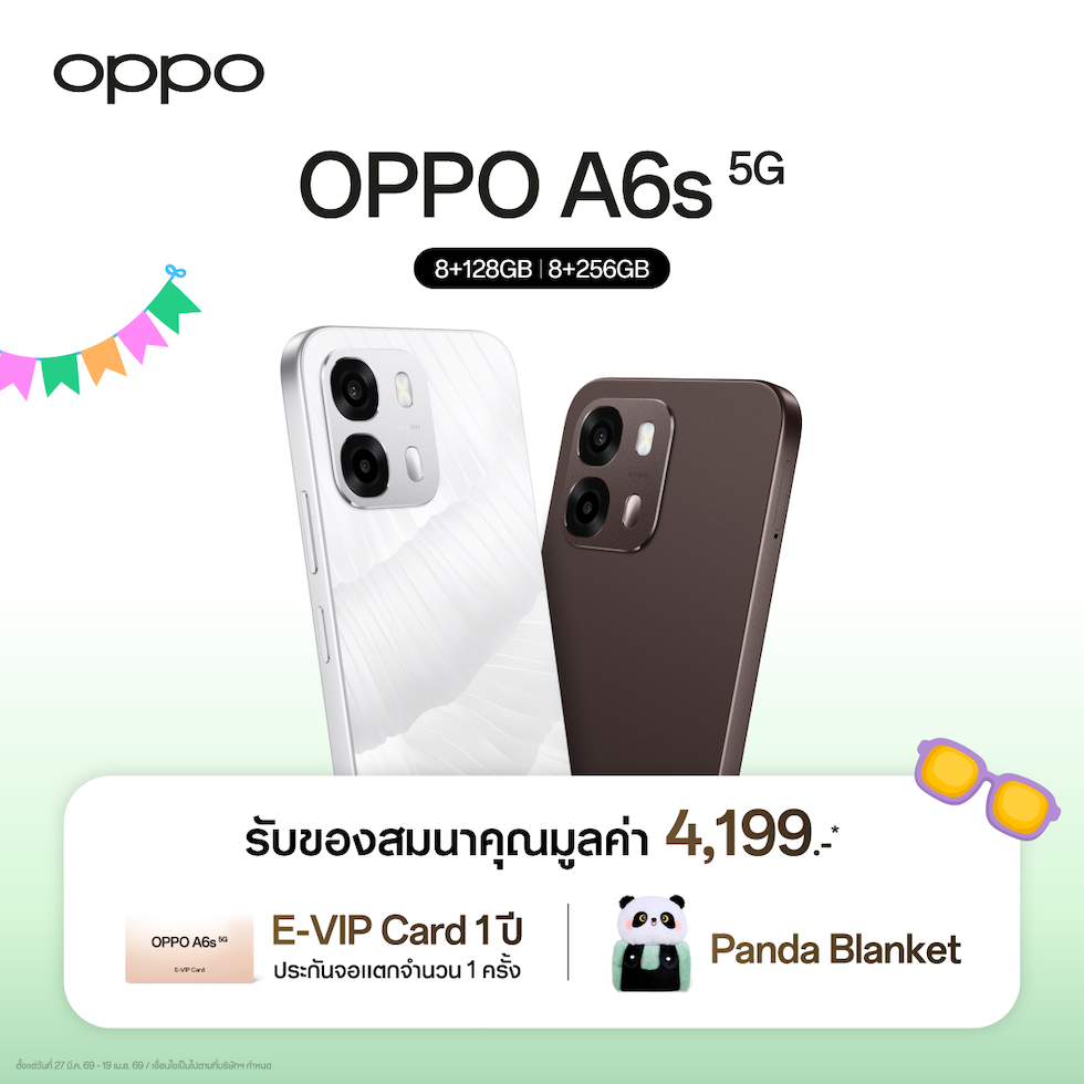 OPPO A6 5G สมาร์ตโฟนจากตระกูลซีรีส์ A สมูทเกินต้าน ทนทานทุกดาเมจ โดยเมื่อซื้อ OPPO A6 5G ในราคา 8,499 บาท หรือ OPPO A6(8+128GB) ในราคา 7,999 บาท และ OPPO A6x 5G ในราคาเริ่มต้น 6,699 บาท รับฟรีทันที! หมอนอิง OPPO AI Phone มูลค่า 399 บา
