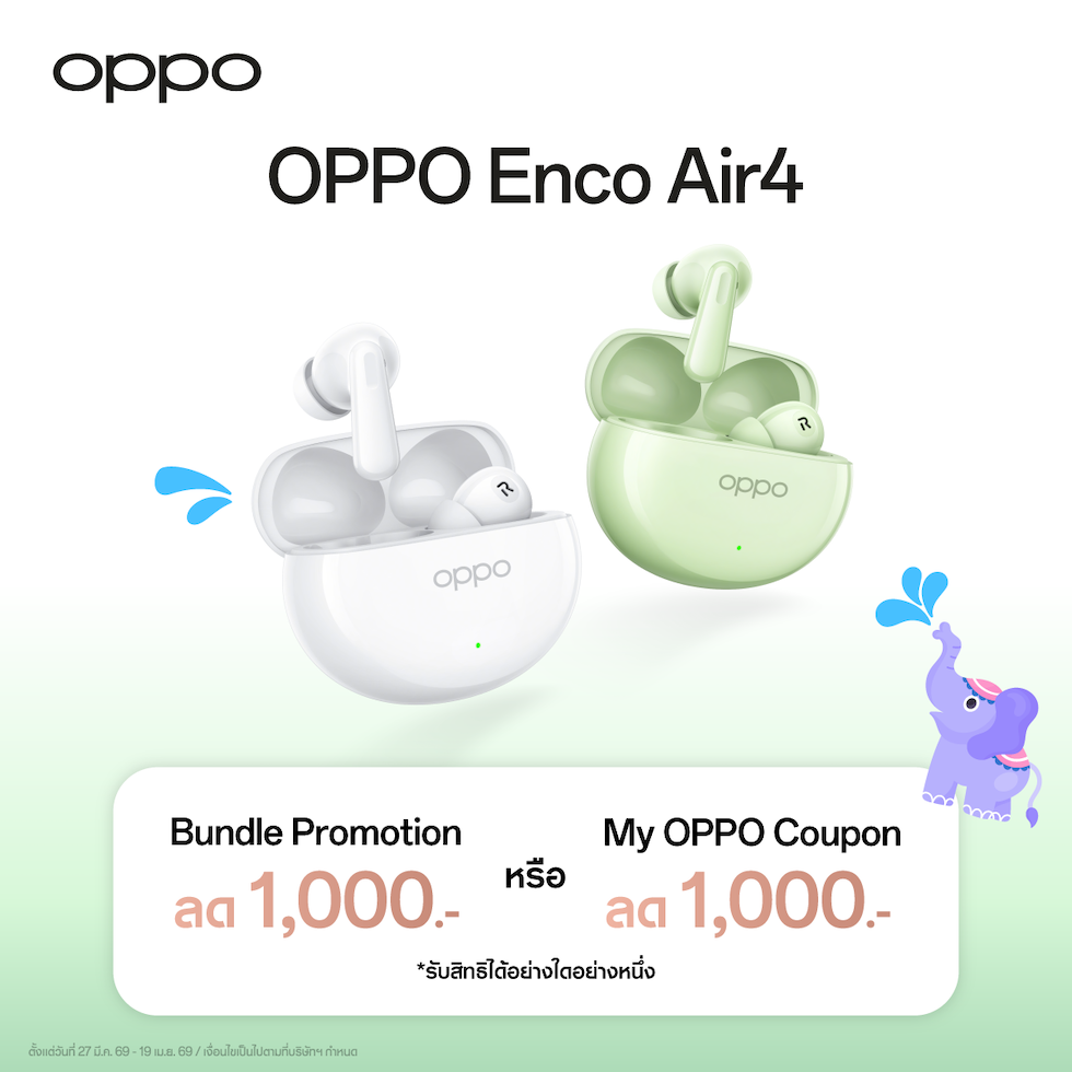 OPPO Enco Air4 โดยเมื่อซื้อ OPPO Enco Air4 ในราคา 1,999 บาท รับทันที! ส่วนลด 1,000 บาท สำหรับ Bundle Promotion (*เมื่อซื้อคู่กับโทรศัพท์ OPPO และ OPPO Pad) หรือ My OPPO Coupon *รับสิทธิได้อย่างใดอย่างหนึ่ง