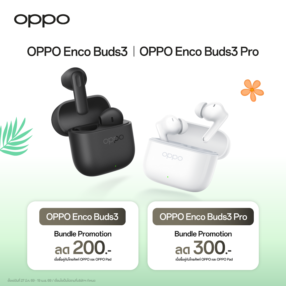 OPPO Enco Buds3 Pro โดยเมื่อซื้อ OPPO Enco Buds3 Pro ในราคา 999 บาท รับทันที! ส่วนลด 300 บาท สำหรับ Bundle Promotion *เมื่อซื้อคู่กับโทรศัพท์ OPPO และ OPPO Pad