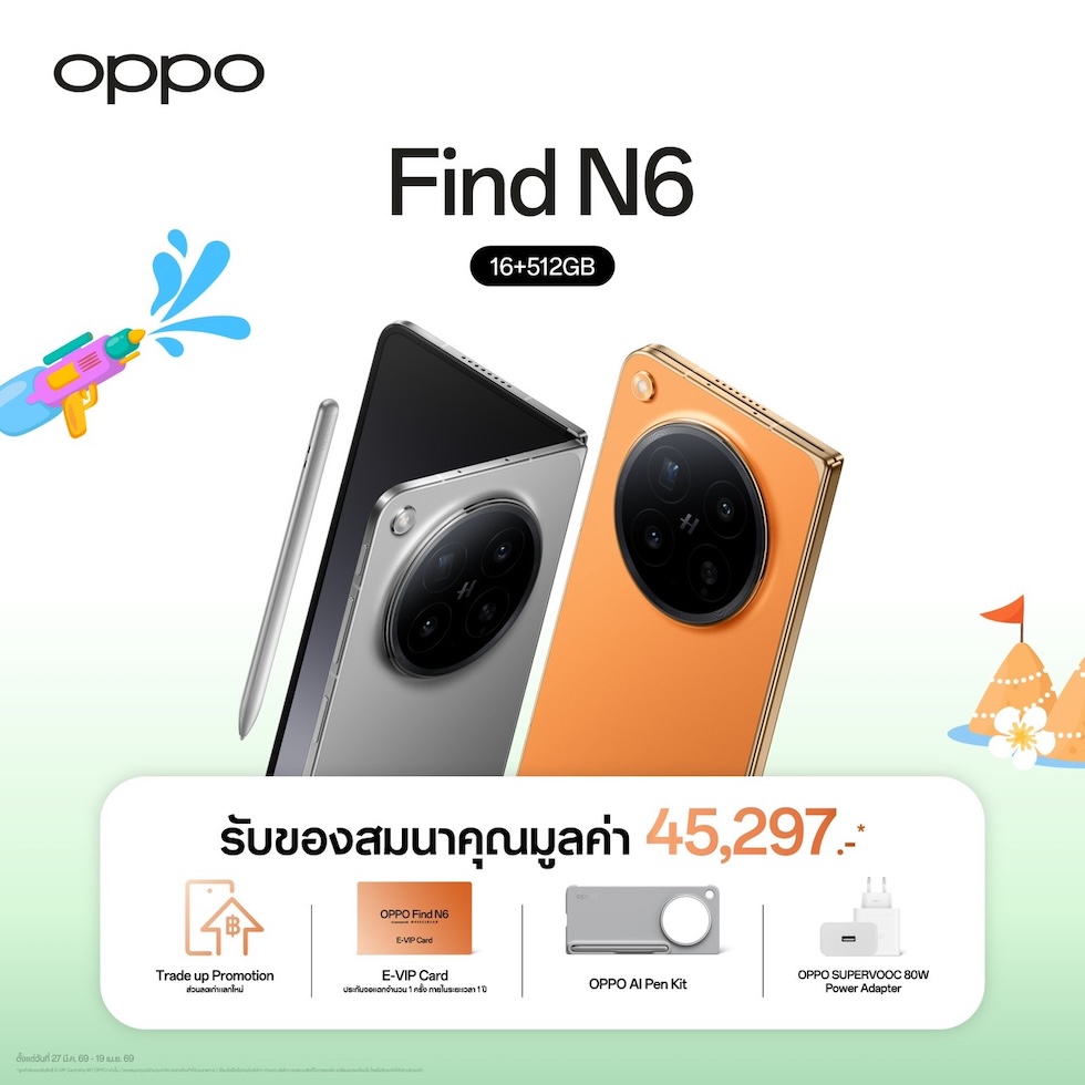 OPPO Find N6 เรียบกว่า อิสระกว่า ทรงพลังทุกมิติ ครั้งแรกของอุตสาหกรรมสมาร์ตโฟนจอพับ กับรอยพับที่แทบมองไม่เห็น ดีไซน์บางเบา เปิดแอปฯได้พร้อมกันสูงสุด 4 แอปฯ ปรับขนาดได้อิสระ พร้อม Boundless View ที่ช่วยให้ใช้งานหลายแอปฯได้พร้อมกัน เสริมศักยภาพการทำงานด้วย OPPO AI Pen ที่เขียนได้แม่นยำ ตอบสนองไวเสมือนใช้ปากกาจริง เก็บรายละเอียดทุกช็อตอย่างเหนือระดับด้วยกล้อง Hasselblad ความละเอียด 200MP ให้ภาพคมชัดและสีสันสมจริง โดยเมื่อซื้อ OPPO Find N6 ในราคา 79,999 บาท รับทันที! ของสมนาคุณ มูลค่ารวม 45,297 บาท ดังนี้