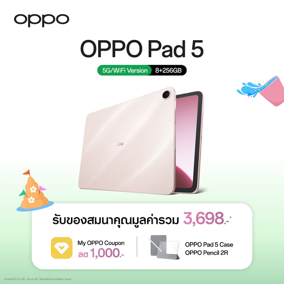 OPPO Pad 5 แท็บเล็ตที่ตอบโจทย์ไลฟ์สไตล์คนรุ่นใหม่ โดยเมื่อซื้อ OPPO Pad 5 ในราคาเริ่มต้น 13,999 บาท รับทันที! ของสมนาคุณ มูลค่ารวม 3,698 บาท ดังนี้