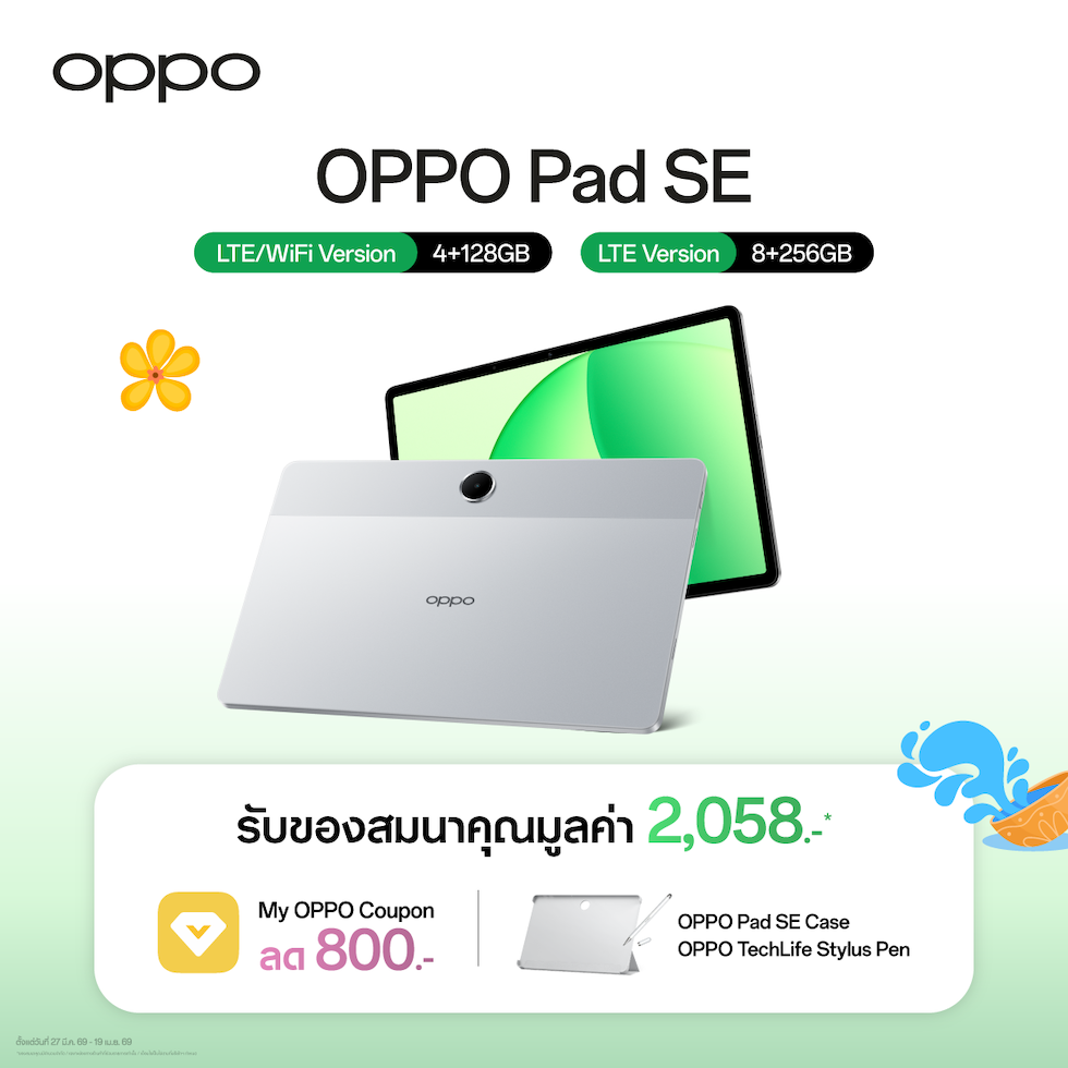OPPO Pad SE แท็บเล็ตที่พร้อมมอบความบันเทิงเต็มรูปแบบ และการใช้งานสุดสมาร์ท โดยเมื่อซื้อ OPPO Pad SE ในราคาเริ่มต้น 5,999 บาท รับทันที! ของสมนาคุณ มูลค่ารวม 2,058 บาท ดังนี้