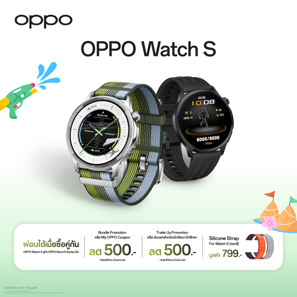 - ผ่อนได้เมื่อซื้อคู่กัน : เมื่อซื้อ OPPO Watch S คู่กับ OPPO Reno15 Series 5G