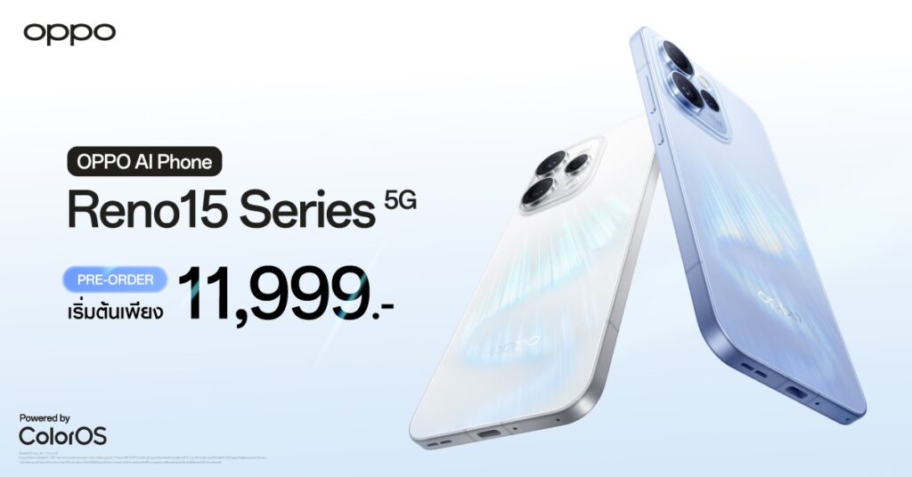 ออปโป้ ไทยแลนด์ ผู้นำตลาดสมาร์ตโฟน ตอกย้ำการเป็นผู้เชี่ยวชาญด้านการถ่ายภาพพอร์ตเทรต เปิดตัว “OPPO Reno15 Series 5G” อย่างเป็นทางการ สมาร์ตโฟนเพื่อนซี้ เทรนดี้ทุกช็อต ครบจบในเครื่องเดียวทั้งการถ่ายภาพและวิดีโอ สานต่อแนวคิด “The Portrait Expert” ยกระดับขีดจำกัดการถ่ายภาพพอร์ตเทรตไปอีกขั้น ชูไฮไลต์กล้องเซลฟี่มุมกว้างพิเศษความละเอียด 50MP มาพร้อมระยะใหม่ 0.6x กว้างที่สุดในอุตสาหกรรม ผสานกล้องพอร์ตเทรตซูมได้ 3.5x ถ่ายทอดภาพบุคคลให้มีมิติ ไวบ์ดี มีสไตล์และเอกลักษณ์ไม่ซ้ำใคร ยกเครื่องระบบปฏิบัติการใหม่ ColorOS 16 และผู้ช่วย AI อัจฉริยะส่วนตัว AI Mind Space รวมข้อมูลและความรู้ส่วนตัวในมือคุณ บนดีไซน์ฝาหลังเอฟเฟกต์แสงออโรร่าพลิ้วไหวสะท้อนการโลดแล่นของแสง โดยเปิดตัวพร้อมกัน 4 รุ่น ได้แก่ OPPO Reno15 F 5G, OPPO Reno15 5G, OPPO Reno15 Pro 5G และใหม่ล่าสุดกับ OPPO Reno15 Pro Max 5G ในราคาเริ่มต้น 11,999 บาท เสริมทัพอีโคซิสเต็มด้วย OPPO Watch S ในราคา 5,999 บาท และ OPPO Pad 5 ในราคาเริ่มต้น 13,999 บาท สัมผัสได้แล้ววันนี้ ณ OPPO Brand Shop ทุกสาขา และตัวแทนจำหน่ายทั่วประเทศ