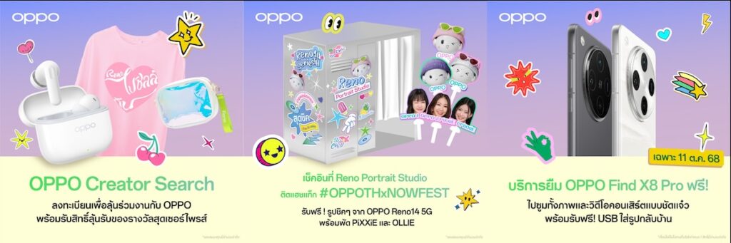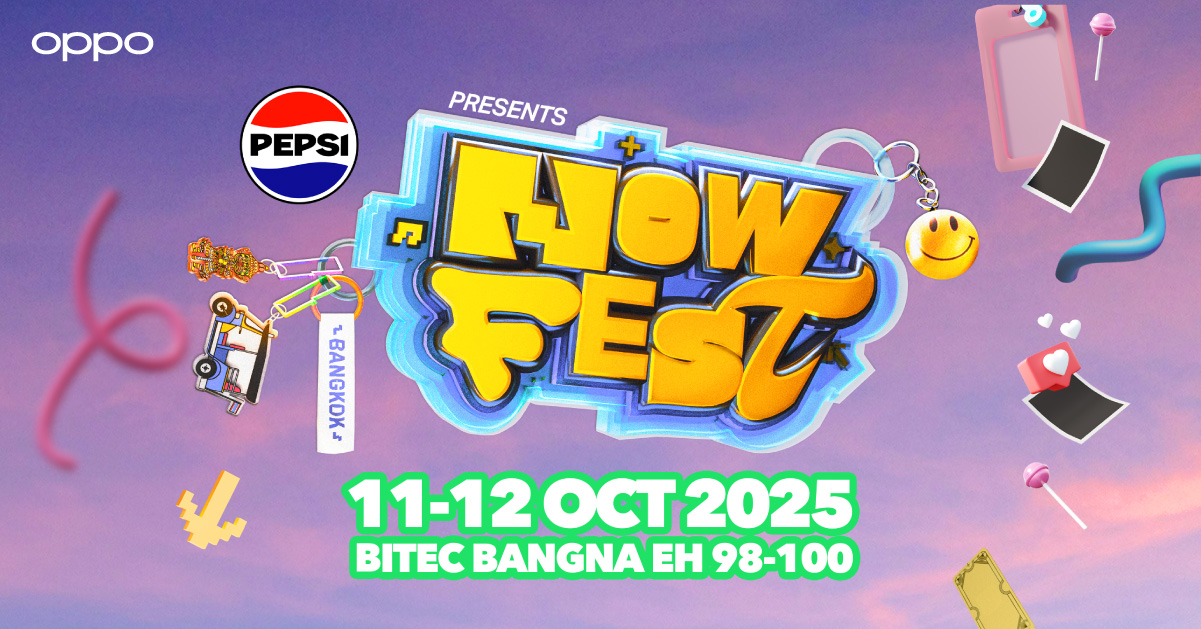 แล้วมาสร้างสีสันและแชร์ความสนุกไปด้วยกัน เตรียมร่างกายให้พร้อม ปลดปล่อยความสนุกสุดเหวี่ยงร่วมเป็นส่วนหนึ่งของความมันส์ครั้งนี้ ห้ามพลาดกับการเก็บภาพความประทับใจให้เต็มที่กับ OPPO ในงาน NOW FEST 2025! เตรียมตัวให้พร้อมรับความมันส์ วันที่ 11 – 12 ตุลาคม 2568 ณ BITEC BANGNA เท่านั้น!