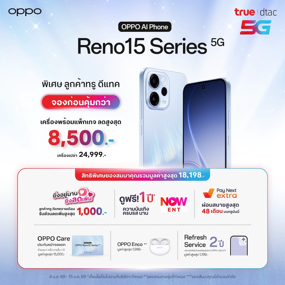 โดย OPPO Reno15 Series 5G พร้อมเป็นผู้นำด้านการถ่ายภาพพอร์ตเทรต อัปเกรดประสบการณ์ถ่ายพอร์ตเทรต และวิดีโอที่ล้ำขึ้นกว่าเดิม ด้วยราคาสุดพิเศษจากกลุ่มทรู เริ่มต้นเพียง 7,499 บาทต่อเดือน ตั้งแต่วันนี้ ถึง 15 มกราคม 2569 ที่ทรูช็อป, ทรูช็อปใน 7-Eleven, ทรูพาร์ทเนอร์ทั่วประเทศ หรือสั่งผ่านช่องทางออนไลน์ส่งฟรีถึงบ้านได้ที่ True Store และ LINE @TrueStore และ ศูนย์บริการดีแทคทั่วประเทศ หรือ dtac online store