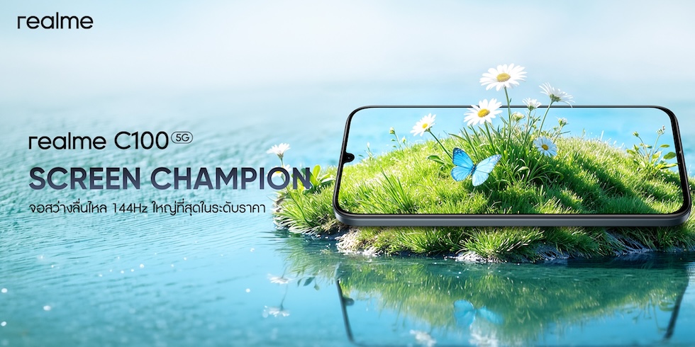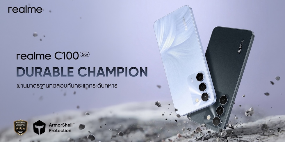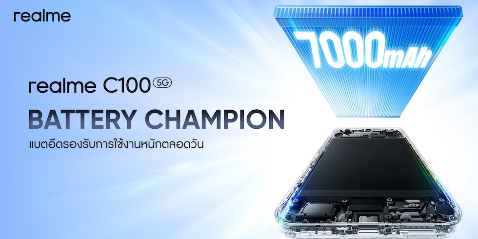 realme เปิดตัวสมาร์ตโฟนสองรุ่นใหม่ใน C100 Series ทั้ง “realme C100 5G” และ “realme C100i” ที่ถูกพัฒนามาเพื่อสร้างมาตรฐานใหม่ในตลาดสมาร์ตโฟนระดับเริ่มต้น มาพร้อมกับสโลแกน “พลังอึด ทนทานระดับแชมป์” โดยเป็นสมาร์ทโฟนประสิทธิภาพสูงที่คุ้มค่าเกินราคาสุด ๆ ด้วยแบตเตอรี่ยักษ์แบบ Titan ความจุ 7000mAh ที่ออกแบบให้ยืนระยะนานถึง 6 ปี พร้อมปกป้องตัวเครื่องด้วยมาตรฐานระดับทหาร และฟีเจอร์ AI ที่พบเฉพาะในรุ่นเรือธง ซึ่งผู้ใช้จะได้ฟีเจอร์ทั้งหมดนี้ในราคาหลักพันเท่านั้น! โดยเฉพาะรุ่นใหญ่อย่าง C100 5G จะเน้นที่ประสิทธิภาพและความสามารถของเครือข่าย 5G เต็มรูปแบบ ส่วนรุ่นน้องอย่าง C100i ตอบโจทย์ผู้ใช้งานที่ต้องการฟีเจอร์ครบครันในราคาที่เข้าถึงได้ยิ่งขึ้น