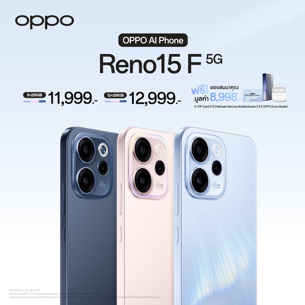 - สำหรับรุ่น OPPO Reno15 F จะได้รับ OPPO Enco Buds3 มูลค่า 799 บาท