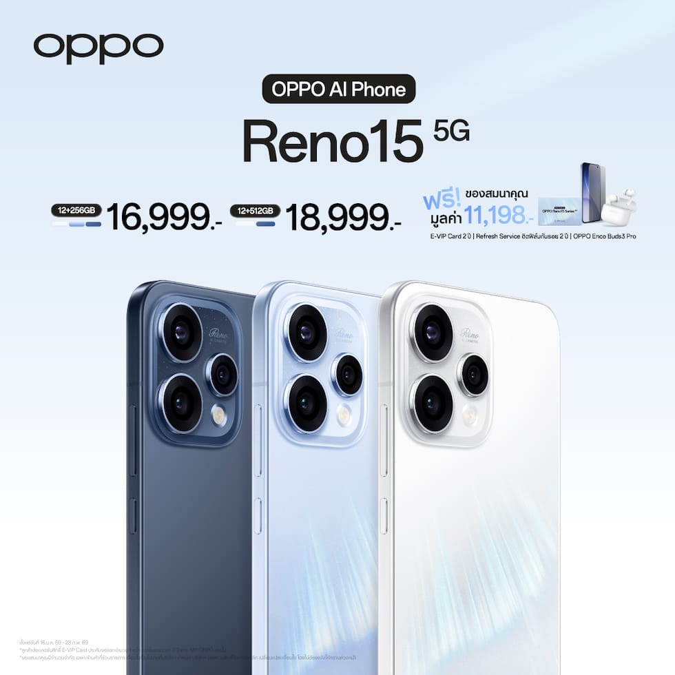 OPPO ประกาศวางจำหน่าย “OPPO Reno15 Series 5G” สมาร์ตโฟนเพื่อนซี้ เทรนดี้ทุกช็อต รุ่นใหม่ล่าสุด วางจำหน่ายในราคาสุดคุ้ม เริ่มต้นเพียง 11,999 บาท มาพร้อมโปรโมชั่นสุดพิเศษในช่วงวันนี้ – 28 กุมภาพันธ์ 2569 อีกทั้งยังมอบทุกประสบการณ์การใช้งานด้วย 2 ผลิตภัณฑ์ IoT ใหม่ อย่าง OPPO Watch S วางจำหน่ายในราคาเริ่มต้น 5,999 บาท และ OPPO Pad 5 ในราคาเริ่มต้น 13,999 บาท