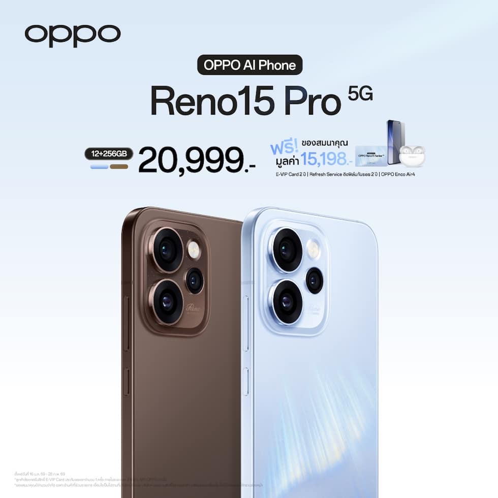 - สำหรับรุ่น OPPO Reno15 5G จะได้รับ OPPO Enco Buds3 Pro มูลค่า 999 บาท