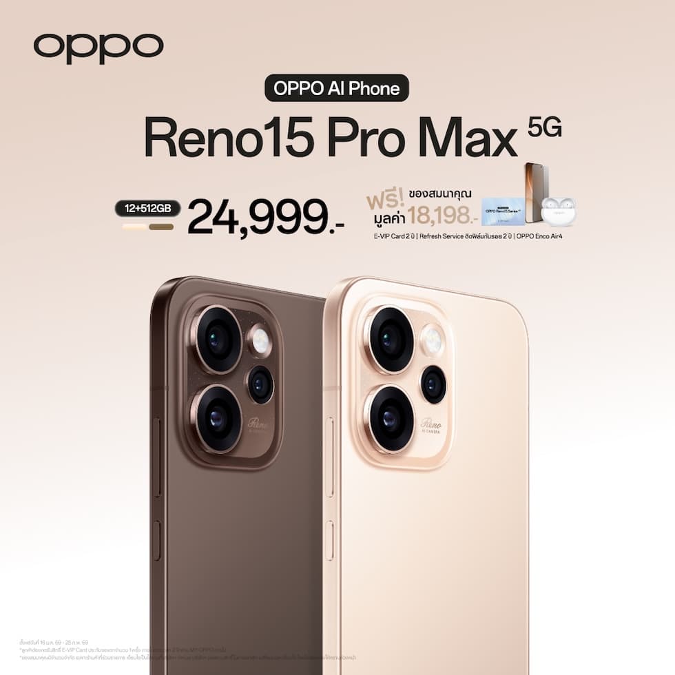 - สำหรับรุ่น OPPO Reno15 Pro Max 5G และ OPPO Reno15 Pro 5G จะได้รับ OPPO Enco Air4 มูลค่า 1,999 บาท