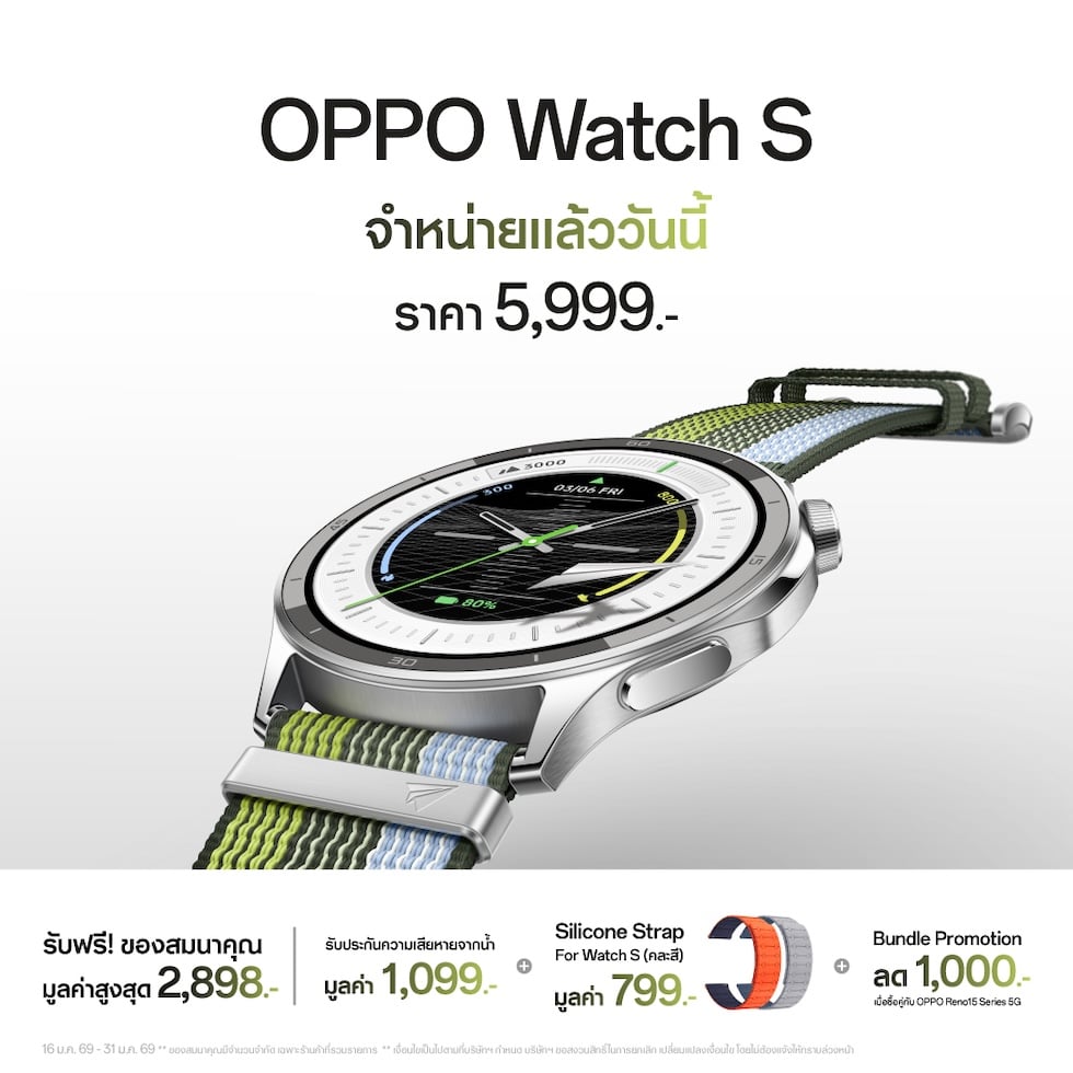 อีกทั้งยังมาพร้อม Bundle Promotion ลด 1,000 บาท เมื่อซื้อ OPPO Watch S คู่กับสมาร์ตโฟน OPPO Reno15 Series 5G